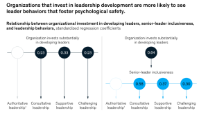 Our findings show that investing in leadership development across an organization—for all leadership positions—is an effective method for cultivating the combination of leadership behaviors that enhance psychological safety. Employees who report that their organizations invest substantially in leadership development are more likely to also report that their team leaders frequently demonstrate consultative, supportive, and challenging leadership behaviors. They also are 64 percent more likely to rate senior leaders as more inclusive. However, the results suggest that the effectiveness of these programs varies depending upon the skills they address.